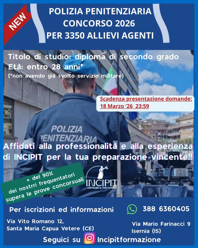 Per le esigenze di reclutamento di un numero complessivo di n. 3.350 (3.048 uomini e 302 donne) allievi agenti del Corpo di polizia penitenziaria sono indetti i seguenti concorsi pubblici:
