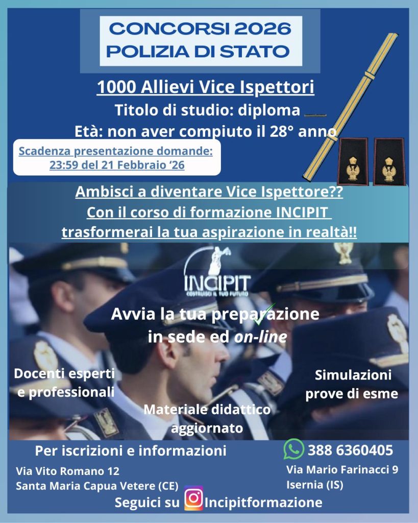 E’ stato indetto con decreto del 19 gennaio 2026 e pubblicato lo scorso 22 gennaio il Bando relativo al Concorso pubblico, per esami, per l’assunzione di 1.000 allievi vice ispettori della Polizia di Stato indetto con decreto del 19 gennaio 2026.