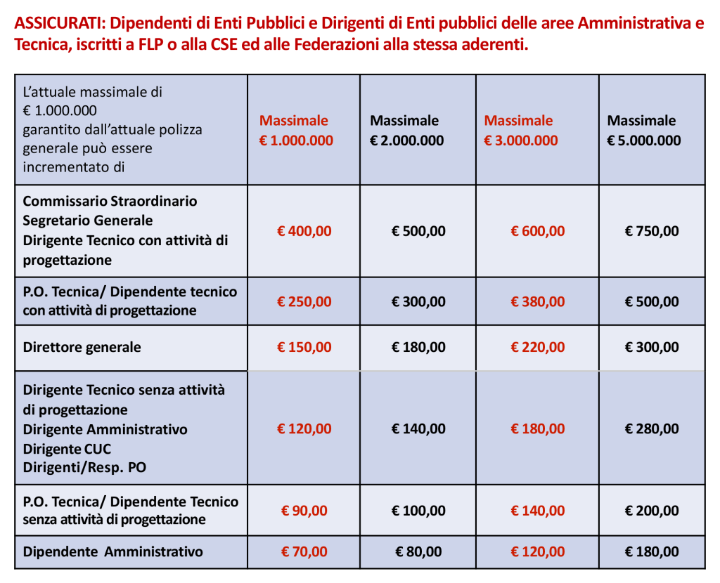 Tuttavia, al fine di fornire un prodotto assicurativo con una copertura più ampia, anche in considerazione delle crescenti responsabilità di chi opera negli Enti e nelle Pubbliche Amministrazioni, la Segreteria Generale della Federazione FLP ha richiesto ed ottenuto dalla società assicuratrice la possibilità, per ogni singolo iscritto, di poter aumentare il proprio massimale per la RC patrimoniale.
